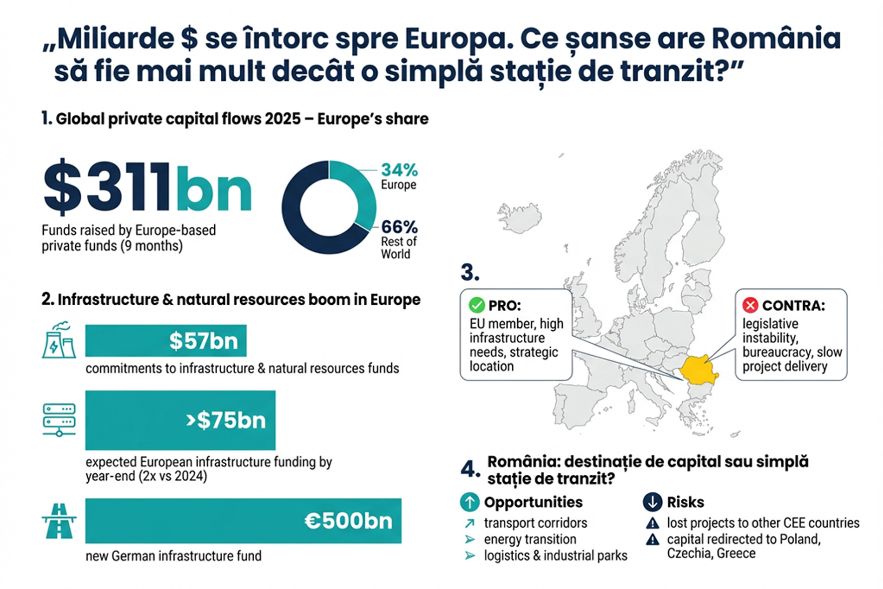 Giganți globali precum KKR și Blackstone anunță clar că vor investi masiv în Europa, iar casa franceză Ardian a strâns recent 20 mld. $ pentru un fond de infrastructură axat în principal pe proiecte europene.
