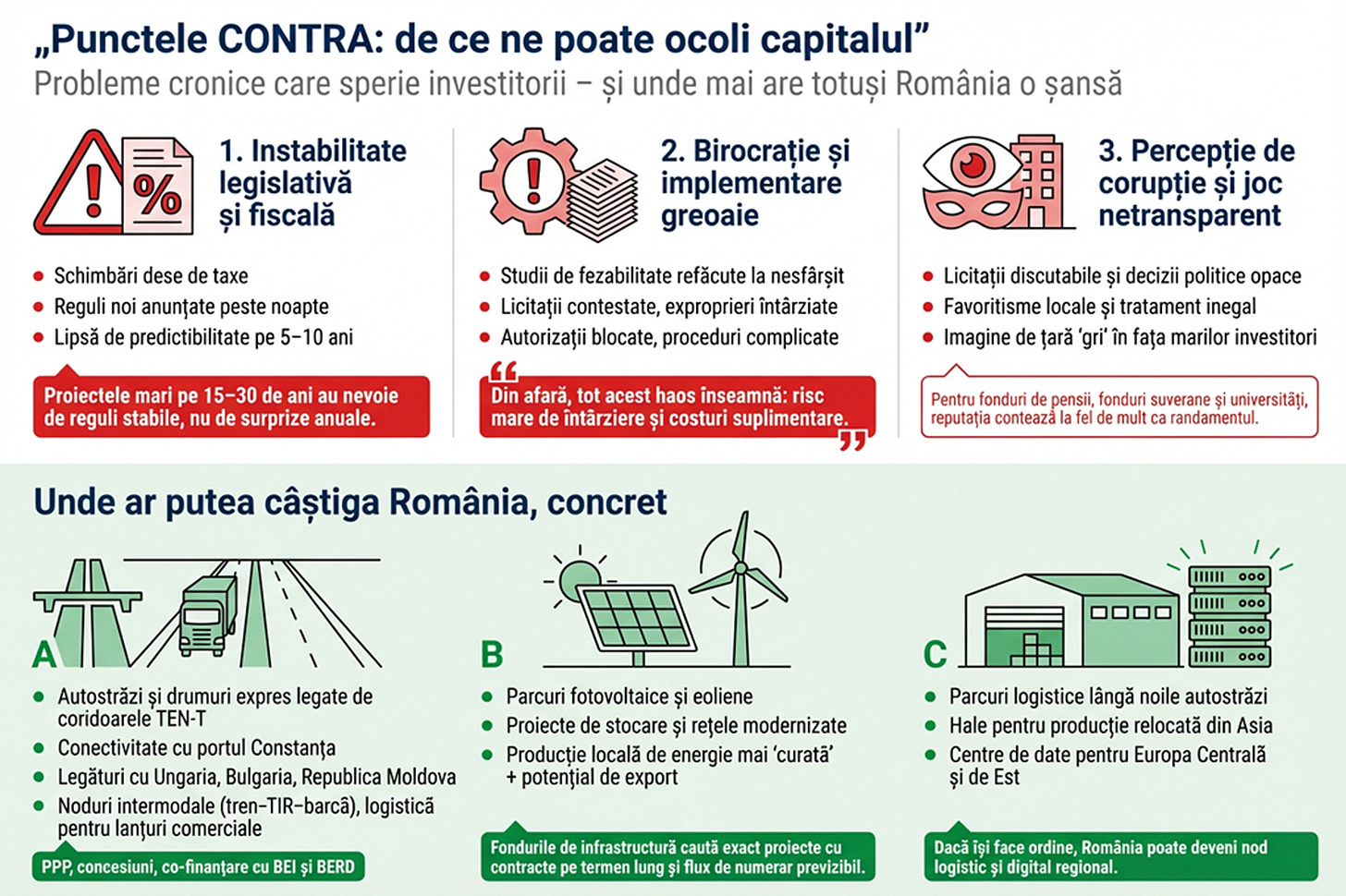 Partea mai puțin plăcută este că avantajele de mai sus nu sunt suficiente dacă România nu rezolvă câteva probleme cronice. Din perspectiva unui investitor mare, există câteva „steaguri roșii”:
