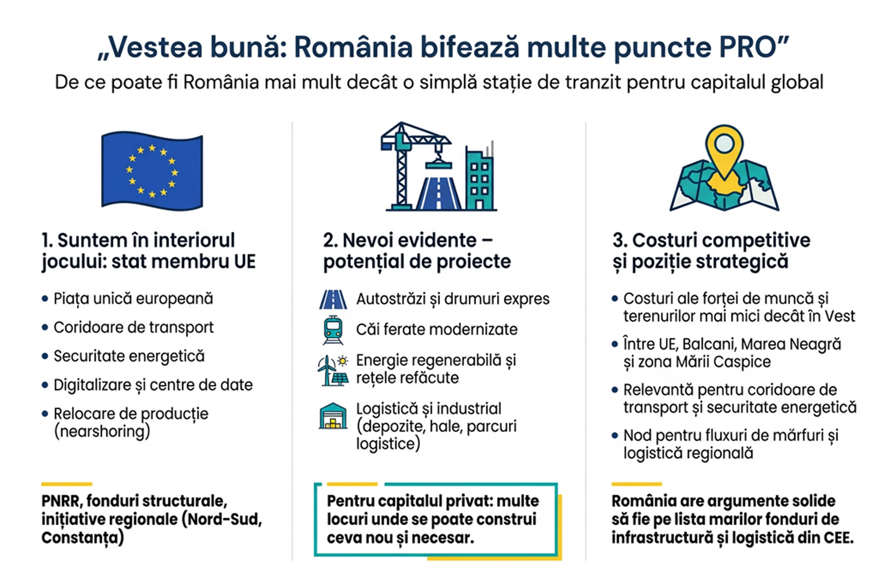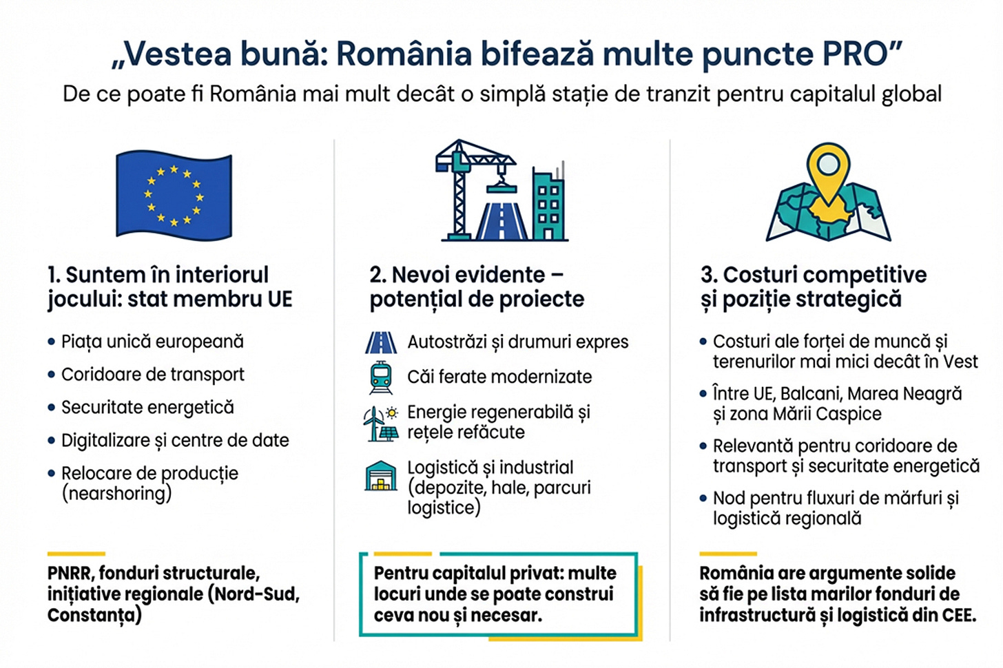 Dacă un fond mare vrea o platformă regională de infrastructură sau logistică în CEE, România are argumente solide să fie pe listă.