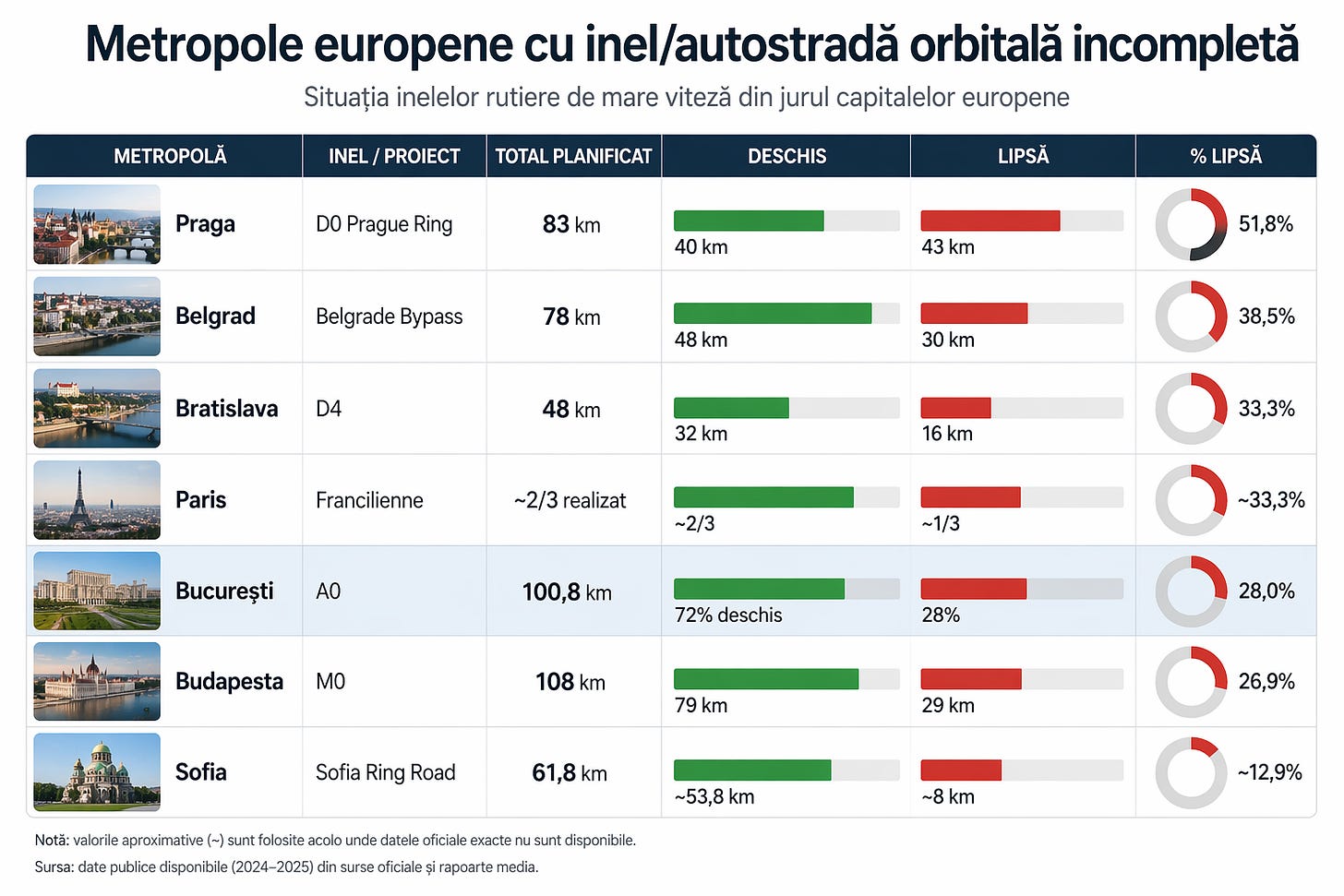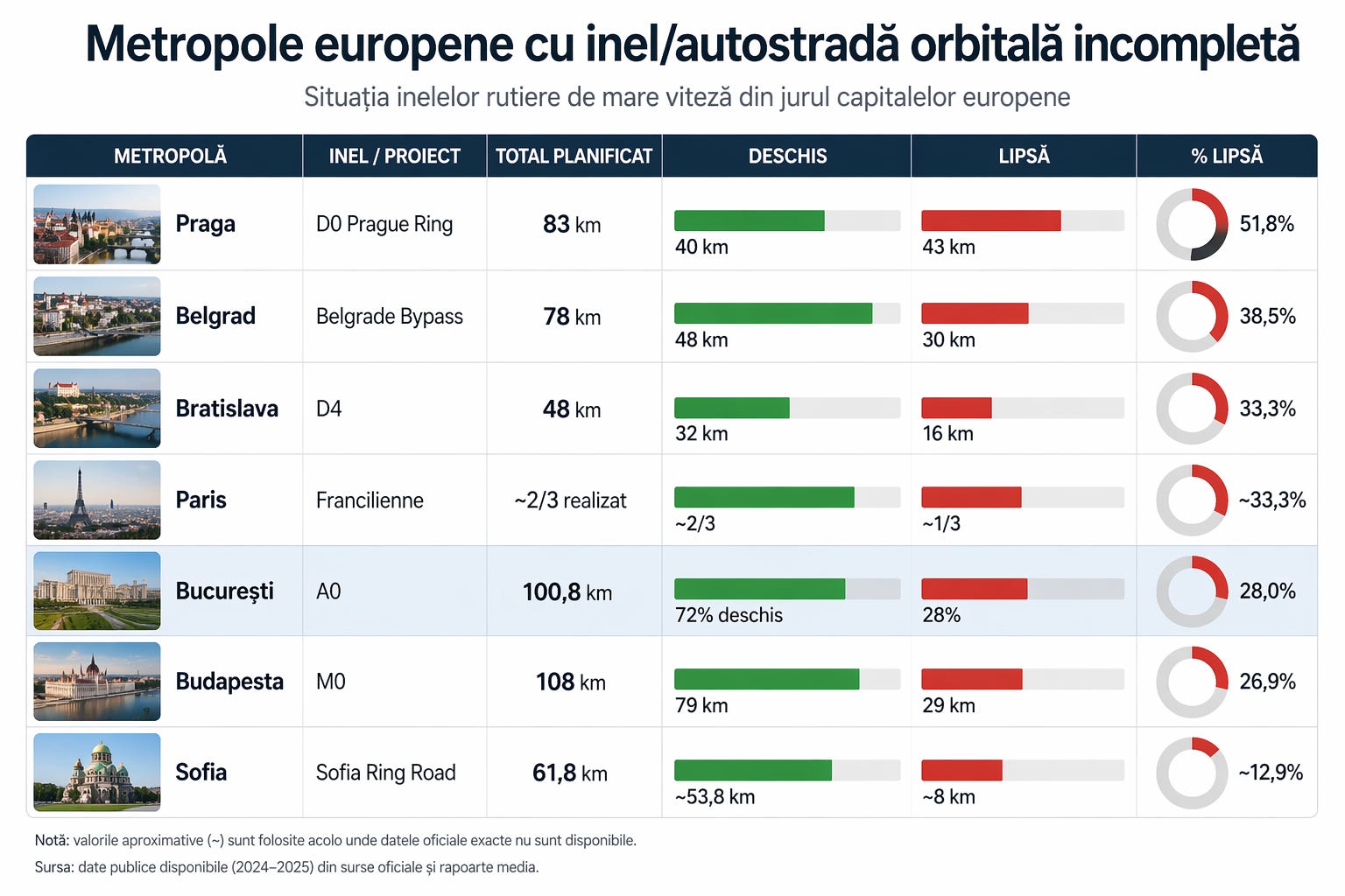 De ani buni circulă legenda că: „Bucureștiul e singura capitală europeană fără autostradă inel ocolitor.” Nu este adevărat. Praga are D0 incompletă, cu aproximativ 40 km în operare dintr-un total planificat de circa 83 km. Budapesta are M0 incompletă, cu 79 km existenți din 108 km planificați. Bratislava are D4 incompletă, cu 32 km din 48 km. Belgradul are bypass-ul incomplet, cu 48 km deschiși din 78 km. Parisul nu are nici azi Francilienne completă, iar pentru Sofia sursele publice recente indică un nivel de realizare de circa 85%, deci nici acolo inelul nu este încă închis integral. Bucureștiul, prin A0, este la aproximativ 72% deschis și 28% încă în lucru. Pare că totuși, capitala României e singura care are șanse reale ca până la finalul anului să finalizeze întregul inel A0.