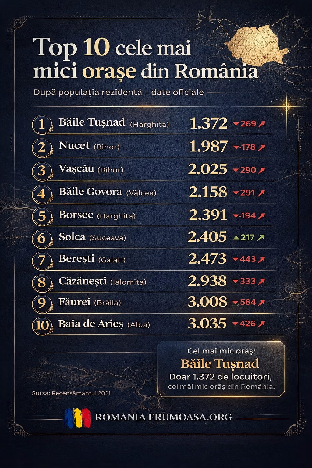 Imaginea de ansamblu este destul de clară: în România, cele mai mici orașe sunt, în mare parte și orașe aflate sub presiune demografică. Unele au coborât sub praguri care le apropie mai degrabă de comune mici decât de așezări urbane clasice, iar între 2011 și 2021 aproape toate au continuat să piardă locuitori. Solca este excepția notabilă din acest top, în timp ce Băile Tușnad rămâne, după datele oficiale ale recensământului, cel mai mic oraș din România.